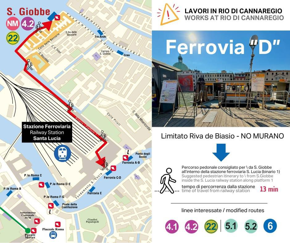 If you are going to be in Venice in the next 18 (or so) months, know that there is a change in the vaporetto stops – a big one for those of us who use the Rio Cannaregio Canal Routes like the 4.1, 4.2, 5.1, 5.2 and the 3.