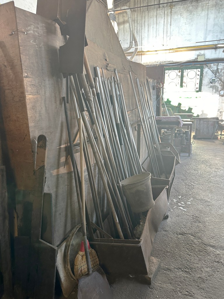 A stash of blow pipes surround the furnace. Blow pipes are used to make hollow glass articles like vases, bowls and bottles. While the Pontil (Punt, Punty Rod) is a long rod used when sculpting animals and also to transfer a blown piece to the annealing oven. Some of the items made on the end of the punty are shown
