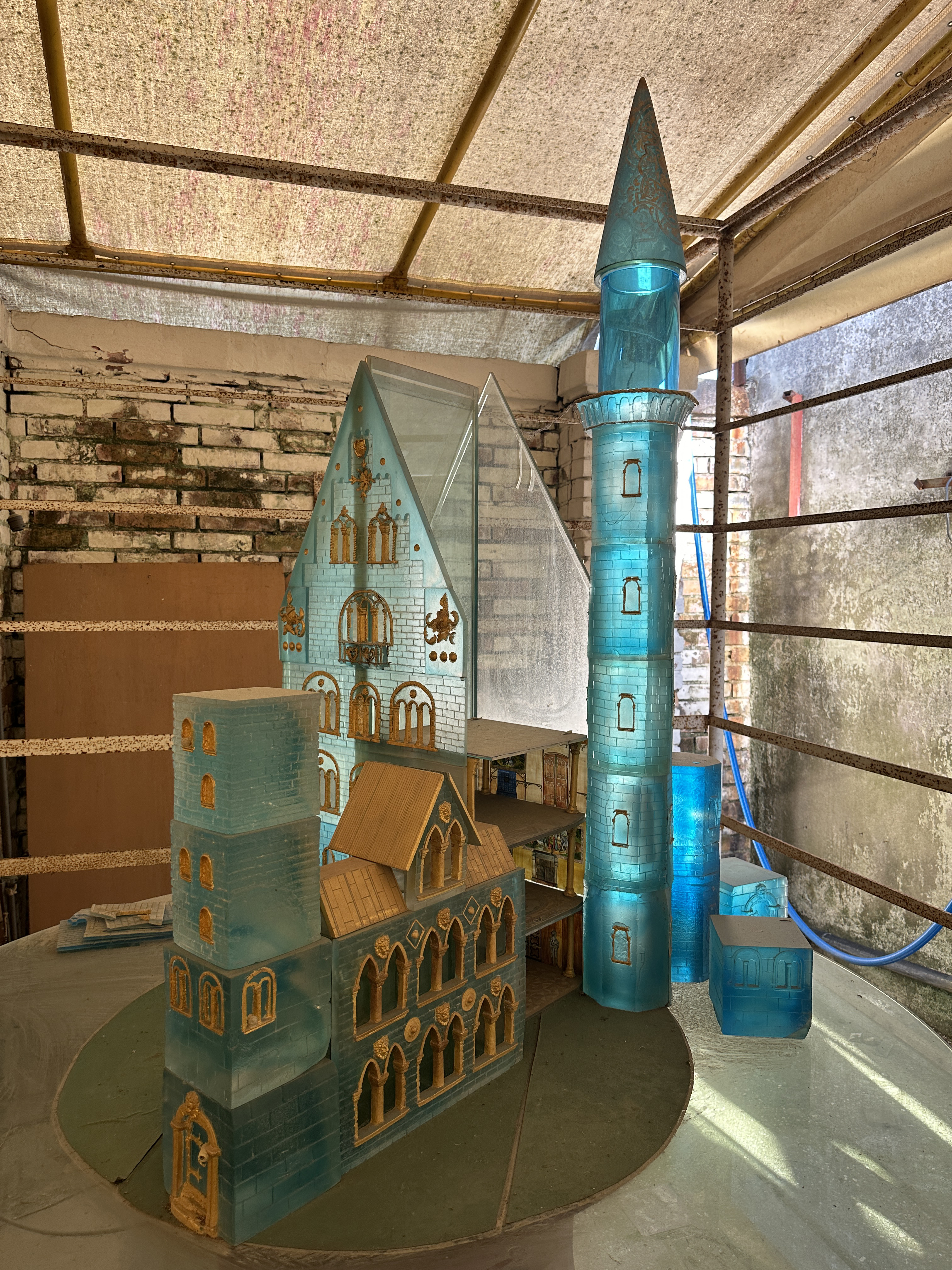 Here you can see the evolution of his creation with the small version and to the right the wax for the casting of Red Square, Moscow. Behind on the shelves are previous projects and ideas for the future.