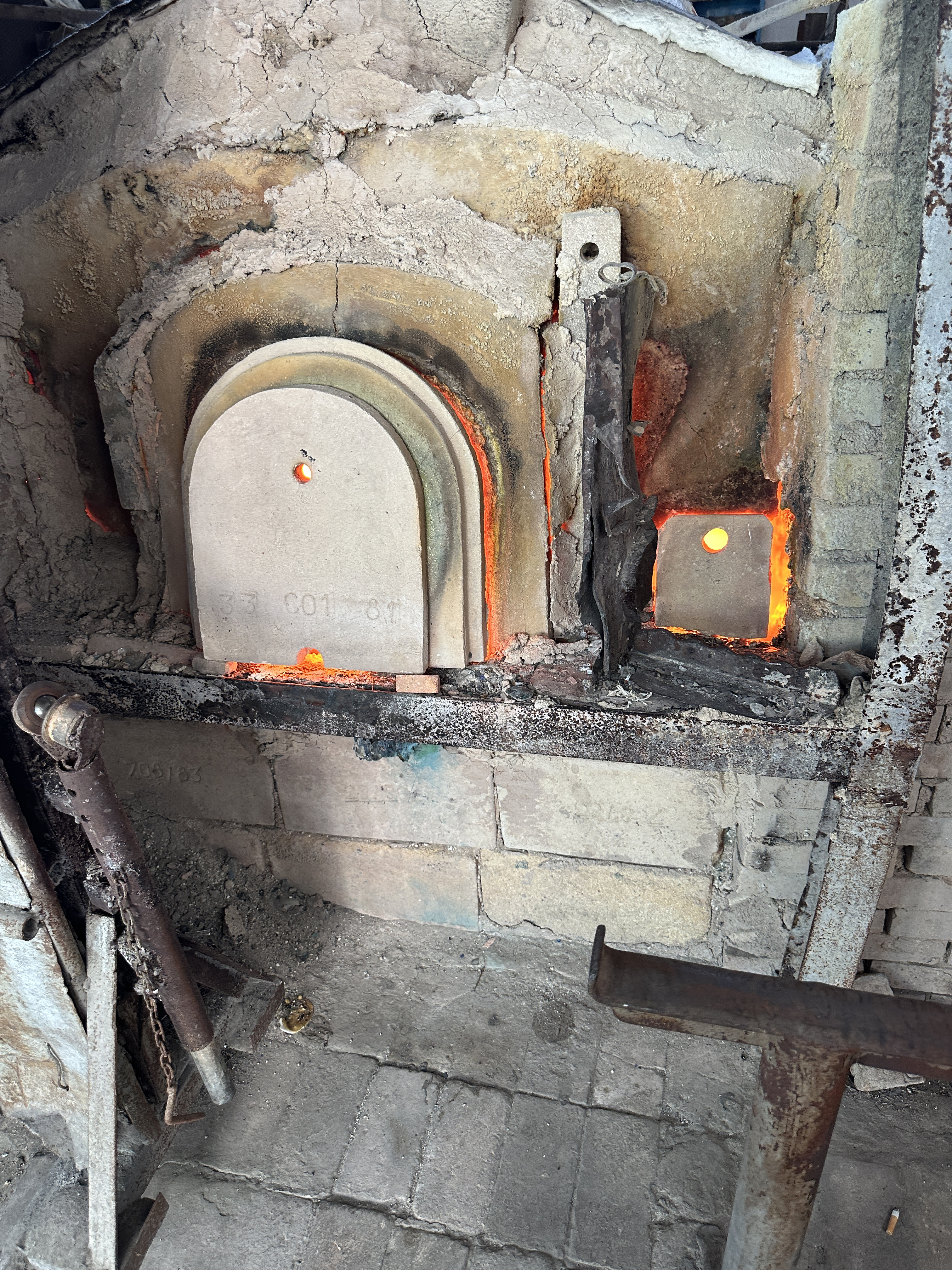 A stash of blow pipes surround the furnace. Blow pipes are used to make hollow glass articles like vases, bowls and bottles. While the Pontil (Punt, Punty Rod) is a long rod used when sculpting animals and also to transfer a blown piece to the annealing oven. Some of the items made on the end of the punty are shown