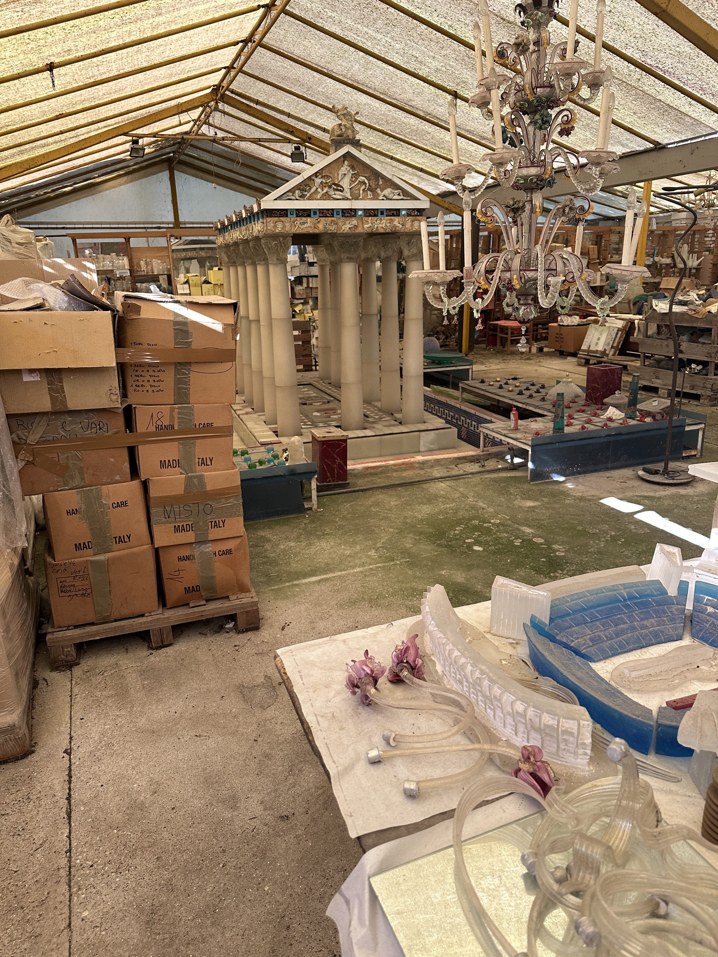 His work shop covers a rambling acreage on the island of Serenella in the Murano islands bringing his ideas to life away from the busy tourist paths of Murano. It also includes fruit trees and bees. Inside, the workshop is a glimpse into the mind of a true artist. He is a large, gentle Muranese who speaks in a soft voice and loves discussing his art. He creates glass pieces for the who’s who of fashion and is the go-to for large pieces like this.